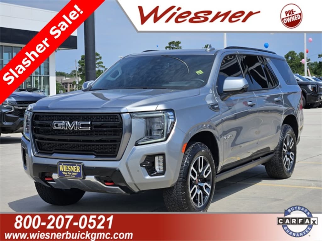 New Price! CARFAX One-Owner. Certified. Sterling Metallic 2023 GMC Yukon AT4 Premium 4WD 10-Speed Automatic with Overdrive EcoTec3 5.3L V8 4WD, 15" Diagonal Multi-Color Head-Up Display, 2 Presets For Outside Rearview Mirrors, 3 Years of GMC Connected Services, 3 Years of OnStar Safety & Security, 3.23 Rear Axle Ratio, 3rd Row 60/40 Power-Folding Split-Bench Seat, 4-Wheel Disc Brakes, 9 Speakers, ABS brakes, Adaptive suspension, Air Conditioning, Alloy wheels, AM/FM radio: SiriusXM with 360L, AM/FM Stereo, Apple CarPlay/Android Auto, AT4 Premium Package, Auto High-beam Headlights, Auto-dimming door mirrors, Auto-dimming Rear-View mirror, Auto-leveling suspension, Automatic Emergency Braking, Automatic temperature control, Black Roof-Mounted Luggage Rack Side Rails, Bose 9-Speaker Stereo Audio System Feature, Brake assist, Bright Front & Rear Door Sill Plates, Delay-off headlights, Driver vanity mirror, Dual front impact airbags, Dual front side impact airbags, Dual-Pane Panoramic Power Sunroof, Electronic Stability Control, Emergency communication system: OnStar and GMC connected services capable, Following Distance Indicator, Forward Collision Alert, Four wheel independent suspension, Front & Rear Park Assist, Front Bucket Seats, Front Center Armrest, Front dual zone A/C, Front fog lights, Front High-Approach Angle Fascia, Front Pedestrian Braking, Fully automatic headlights, Hands-Free Power Programmable Rear Liftgate, HD Surround Vision, Heated & Ventilated Driver & Front Passenger Seats, Heated 2nd Row Outboard Position Seats, Heated Driver & Front Passenger Seats, Heated Steering Wheel, Heavy-Duty Air Filter, Hill Descent Control, Inside Rear-View Auto-Dimming Mirror, Low tire pressure warning, Memory seat, Navigation System, Occupant sensing airbag, Outside Heated Power-Adjustable Mirrors, Panic alarm, Perforated Leather Seating Surfaces, Power driver seat, Power Liftgate, Power Release 2nd Row 60/40 Split-Folding Bench Seat, Power steering, Power Tilt & Telescopic Steering Column, Power windows, Power-Retractable Assist Steps, Preferred Equipment Group 4SB, Rain sensing wipers, Rear air conditioning, Rear Pedestrian Alert, Rear window defroster, Rear window wiper, Red Horizontal-Mounted Recovery Hooks, Remote keyless entry, Safety Alert Seat, Security system, SiriusXM w/360L, Speed control, Speed-sensing steering, Steering wheel memory, Steering wheel mounted audio controls, Technology Package, Traction control, Universal Home Remote, Variably intermittent wipers, Ventilated front seats, Wheel Locks (Set of 4) (LPO), Wheels: 20" x 9" 6-Spoke Machined Aluminum, Wireless Charging.