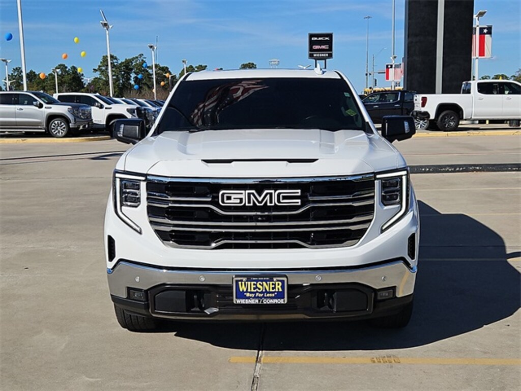 Recent Arrival! CARFAX One-Owner. Clean CARFAX. Certified. Summit White 2025 GMC Sierra 1500 SLT 4WD 10-Speed Automatic EcoTec3 5.3L V8 10-Speed Automatic, 4WD, Jet Black Leather.
