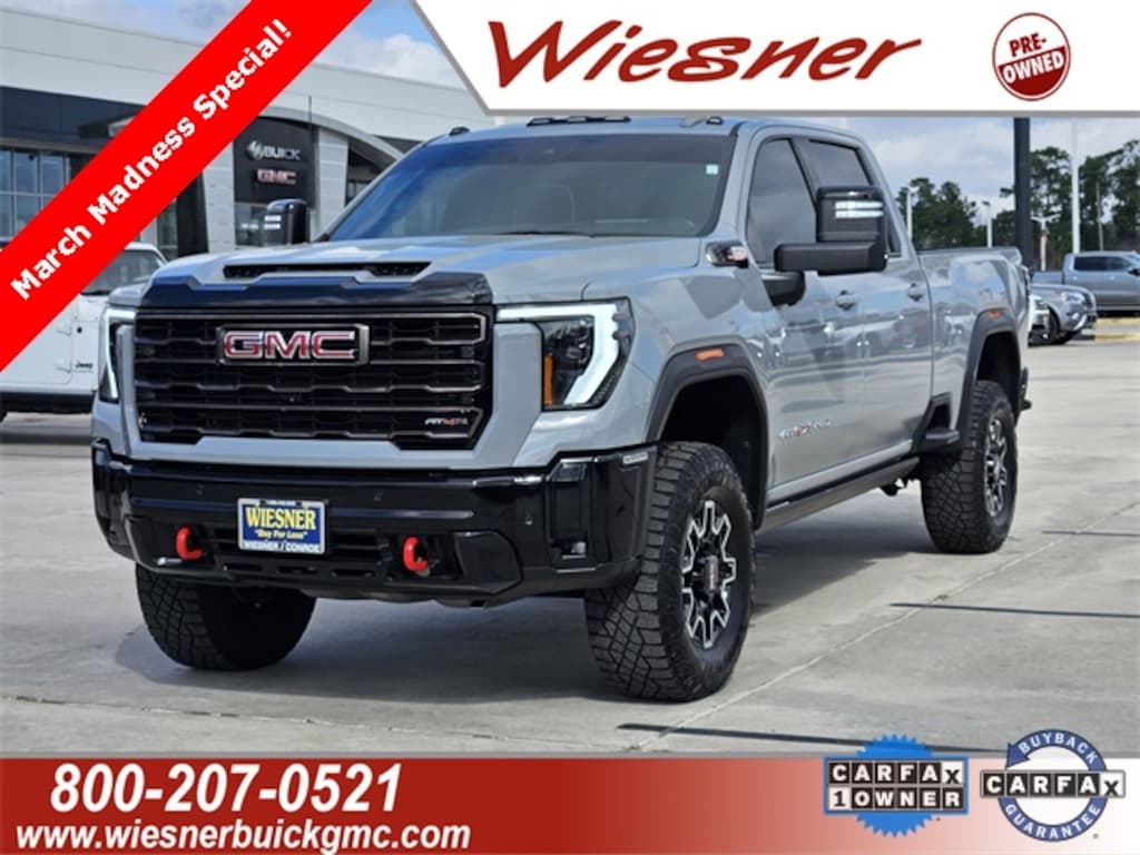Recent Arrival! CARFAX One-Owner. Clean CARFAX. Certified. Thunderstorm Gray 2025 GMC Sierra 2500HD AT4X 4WD 10-Speed Automatic Duramax 6.6L V8 Turbodiesel 10-Speed Automatic, 4WD, Obsidian Rush Leather, 12 Speakers, 120-Volt Bed Mounted Power Outlet, 120-Volt Instrument Panel Power Outlet, 16-Way Power Driver Seat Adjuster w/Lumbar, 16-Way Power Passenger Seat Adjuster w/Lumbar, 2 Charge-Only Rear USB Ports, 2 Charge/Data USB Ports Inside Center Console, 2 USB Ports, 2-Speed Active Transfer Case, 3.42 Axle Ratio, 4-Wheel Disc Brakes, ABS brakes, Air Conditioning, Apple CarPlay/Android Auto, Auto High-beam Headlights, Auto-dimming door mirrors, Auto-dimming Rear-View mirror, Automatic Emergency Braking, Automatic temperature control, Bed View Camera w/2 Trailer Camera Provisions, Bose Premium Series 12-Speaker System, Brake assist, Deep-Tinted Glass, Delay-off headlights, Driver door bin, Driver Memory, Driver vanity mirror, Dual front impact airbags, Dual front side impact airbags, Electric Rear-Window Defogger, Electronic Stability Control, Emergency communication system: OnStar, Floor-Mounted Center Console, Front Bucket Seats, Front Center Armrest, Front dual zone A/C, Front fog lights, Front Prem Floor Liners w/Removable Carpet Insert, Front Rain-Sensing Wipers, Full Grain Leather Seat Trim, Fully automatic headlights, Gloss Black Header Grille & Grille Insert Bars, HD Surround Vision, Heads-Up Display, Heated 2nd Row Outboard Seats, Heated door mirrors, Heated Driver & Front Outboard Passenger Seats, Heated front seats, Heated rear seats, Heated steering wheel, Hill Descent Control, Inside Rearview Auto-Dimming Rear Camera Mirror, Keyless Open & Start, Lane Departure Warning System, Leather steering wheel, LED Cargo Area Lighting, LED Smoked Amber Roof Marker Lamps, Low tire pressure warning, Manual Tilt-Wheel/Telescoping Steering Column, Memory seat, Multicolor 15" Diagonal Head-Up Display, Navigation System, Occupant sensing airbag, Off-Road Suspension, OnStar Services Capable, Panic alarm, Pickup Box, Power door mirrors, Power driver seat, Power Front Passenger Windows w/Express Up/Down, Power Sliding Rear Window w/Defogger, Power steering, Power Sunroof, Power windows, Preferred Equipment Group 4SG, Push Button Start, Radio: AM/FM w/Premium GMC Infotainment System, Rain sensing wipers, Rear Cross Traffic Alert, Rear Prem Floor Liners w/Removable Carpet Insert, Rear Wheelhouse Liners, Rear window defroster, Remote keyless entry, Remote Vehicle Starter System, Safety Alert Seat, Security system, SiriusXM w/360L Trial Subscription, Speed control, Speed-sensing steering, Spray-On Pickup Bedliner w/GMC Logo, Steering Wheel Audio Controls, Steering wheel mounted audio controls, Traction control, Trailer Cam Provisions & Trailer Viewing Software, Trailer Side Blind Zone Alert, Trailer Tire Pressure Monitor Sensors, Turn signal indicator mirrors, Ultrasonic Front & Rear Park Assist, Unauthorized Entry Theft-Deterrent System, Universal Home Remote, Variably intermittent wipers, Ventilated Driver & Front Passenger Seats, Ventilated front seats, Wheels: 18" Machined Alum w/High Gloss Blk Accents, Wireless Charging, Wireless Phone Projection.
