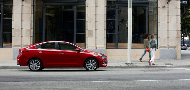 You'll relax in a six-way-adjustable driver seat. The Hyundai car has cloth upholstery and a 60/40-split fold-down rear seat. There's 13.7 cubic-feet of cargo capacity that you can access with the available hands-free smart trunk release. Other design features that you can add to your compact sedan include heated front seats, proximity key with push-button start, sunroof, automatic temperature control, full exterior LED lighting, and heated side mirrors. You can climb inside the new Accent and try out these features during your test drive.