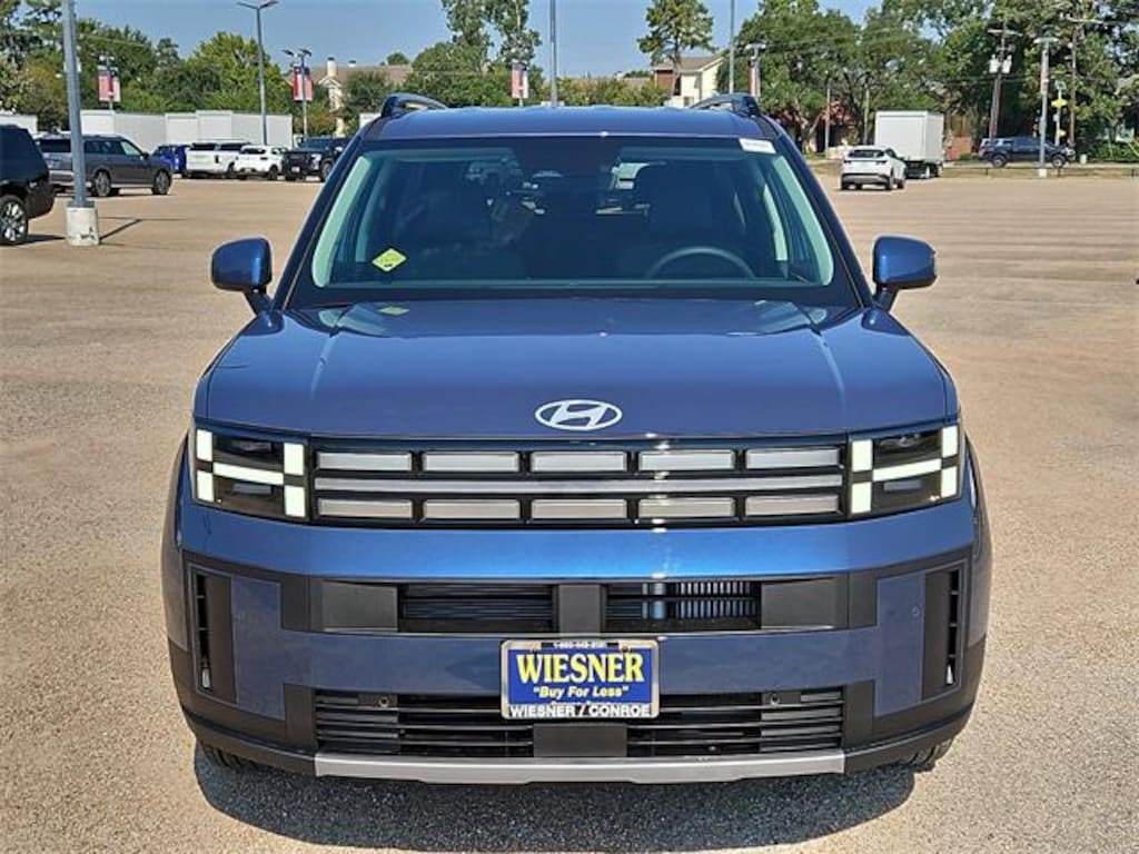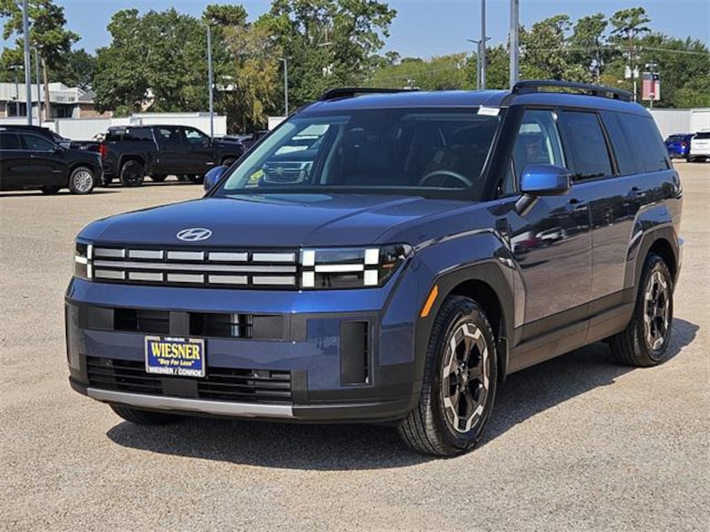 This 2026 Hyundai Santa Fe SEL in Atlantis Blue comes with the following features: 2.5L I4 8-Speed Automatic with SHIFTRONIC FWD Black Premium Synthetic Option Group 01, Black Premium Synthetic, 18" x 7.5J Alloy Wheels, 3rd row seats: bench, 4-Wheel Disc Brakes, 6 Speakers, ABS brakes, Air Conditioning, All Season Fitted Liners, Alloy wheels, AM/FM radio: SiriusXM, Apple CarPlay & Android Auto, Auto High-beam Headlights, Automatic temperature control, Brake assist, Bumpers: body-color, Cargo Net, Carpeted Floor Mats, Delay-off headlights, Driver door bin, Driver vanity mirror, Dual front impact airbags, Dual front side impact airbags, Electronic Stability Control, Emergency communication system, Exterior Parking Camera Rear, First Aid Kit, Four wheel independent suspension, Front anti-roll bar, Front Bucket Seats, Front Center Armrest, Front dual zone A/C, Front reading lights, Fully automatic headlights, H-Tex Leatherette Seat Trim, Heated door mirrors, Heated Front Bucket Seats, Heated front seats, Illuminated entry, Knee airbag, Leather steering wheel, Low tire pressure warning, Mudguards, Occupant sensing airbag, Outside temperature display, Overhead airbag, Overhead console, Panic alarm, Passenger door bin, Passenger vanity mirror, Power door mirrors, Power driver seat, Power Liftgate, Power steering, Power windows, Radio: AM/FM/HD Display Audio, Rear anti-roll bar, Rear seat center armrest, Rear side impact airbag, Rear window defroster, Rear window wiper, Remote keyless entry, Roadside Assistance Kit, Security system, Speed control, Speed-sensing steering, Split folding rear seat, Spoiler, Steering wheel mounted audio controls, Tachometer, Telescoping steering wheel, Tilt steering wheel, Traction control, Trip computer, Turn signal indicator mirrors, and Variably intermittent wipers.