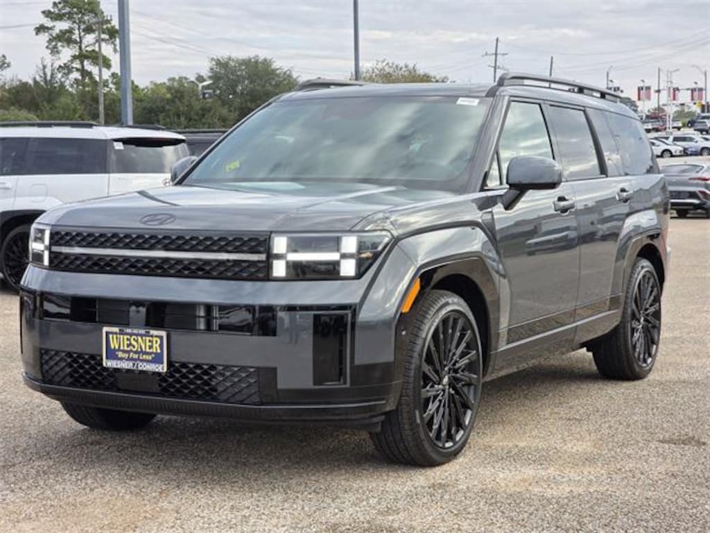 This 2026 Hyundai Santa Fe Calligraphy in Ecotronic Gray comes with the following features: 2.5L I4 8-Speed Automatic with SHIFTRONIC FWD Pecan Brown Leather Option Group 01, Pecan Brown Leather, 12 Speakers, 3rd row seats: bench, 4-Wheel Disc Brakes, ABS brakes, Air Conditioning, Alloy wheels, AM/FM radio: SiriusXM, Apple CarPlay & Android Auto, Auto High-beam Headlights, Auto-dimming Rear-View mirror, Automatic temperature control, Brake assist, Bumpers: body-color, Cargo Cover/Screen, Cargo Net, Cargo Organizer, Cargo Tray, Carpeted Floor Mats, Delay-off headlights, Driver door bin, Driver vanity mirror, Dual front impact airbags, Dual front side impact airbags, Electronic Stability Control, Emergency communication system, Exterior Parking Camera Rear, First Aid Kit, Four wheel independent suspension, Front anti-roll bar, Front Bucket Seats, Front Center Armrest, Front dual zone A/C, Front reading lights, Fully automatic headlights, Garage door transmitter: HomeLink, Heads-Up Display, Heated & Ventilated Front Bucket Seats, Heated door mirrors, Heated front seats, Heated rear seats, Heated steering wheel, Illuminated entry, Knee airbag, Leather steering wheel, Low tire pressure warning, Memory seat, Navigation System, Occupant sensing airbag, Outside temperature display, Overhead airbag, Overhead console, Panic alarm, Passenger door bin, Passenger vanity mirror, Power door mirrors, Power driver seat, Power Liftgate, Power moonroof, Power passenger seat, Power steering, Power windows, Quilted Premium Nappa Leather Seat Trim, Radio: AM/FM/HD Bose Premium Audio System, Rain sensing wipers, Rear anti-roll bar, Rear side impact airbag, Rear window defroster, Rear window wiper, Remote keyless entry, Roadside Assistance Kit, Roof Rack Crossbars, Security system, Speed control, Speed-sensing steering, Split folding rear seat, Spoiler, Steering wheel mounted audio controls, Tachometer, Telescoping steering wheel, Tilt steering wheel, Traction control, Trip computer, Turn signal indicator mirrors, Variably intermittent wipers, Ventilated front seats, and Wheels: 21" x 8.5J Unique Dark Finish Alloy. Price includes: $3500 - Hyundai HMF Dealer Choice : $3500 discount and 5.49% APR for 24 months. $44.09 per $1000 financed. Available to well qualified buyers who finance through Hyundai Motor Finance. H704. Exp. 01/02/2026