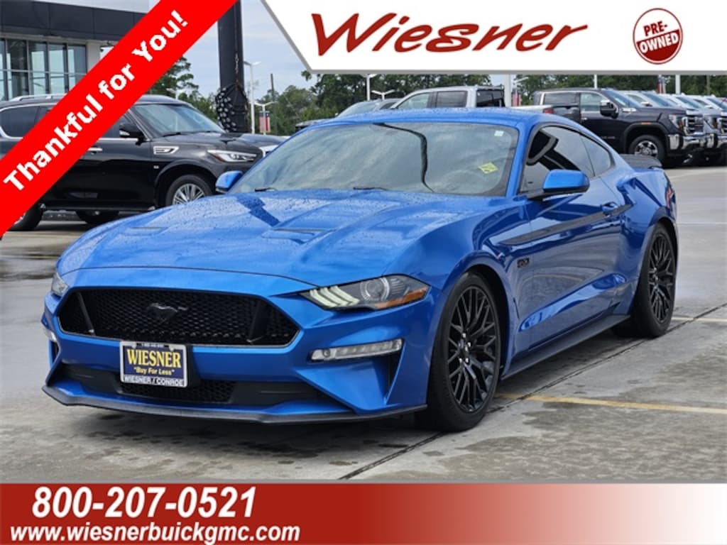 Velocity Blue Metallic 2019 Ford Mustang GT RWD 10-Speed Automatic 5.0L V8 Ti-VCT 4-Wheel Disc Brakes, 6 Speakers, ABS brakes, Air Conditioning, AM/FM radio, AM/FM Stereo, Auto-dimming Rear-View mirror, Brake assist, Cloth Bucket Seats, Delay-off headlights, Dual front impact airbags, Dual front side impact airbags, Electronic Stability Control, Emergency communication system: 911 Assist, Equipment Group 300A, Exterior Parking Camera Rear, Four wheel independent suspension, Front Bucket Seats, Front Center Armrest, Front fog lights, Fully automatic headlights, Low tire pressure warning, Occupant sensing airbag, Panic alarm, Power driver seat, Power passenger seat, Power steering, Power windows, Radio data system, Rear window defroster, Remote keyless entry, Security system, Speed control, Speed-sensing steering, Speed-Sensitive Wipers, Steering wheel mounted audio controls, SYNC Communications & Entertainment System, Traction control, Variably intermittent wipers, Wheels: 18" x 8" Machined-Face Aluminum.